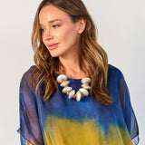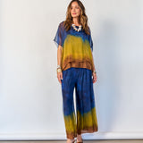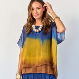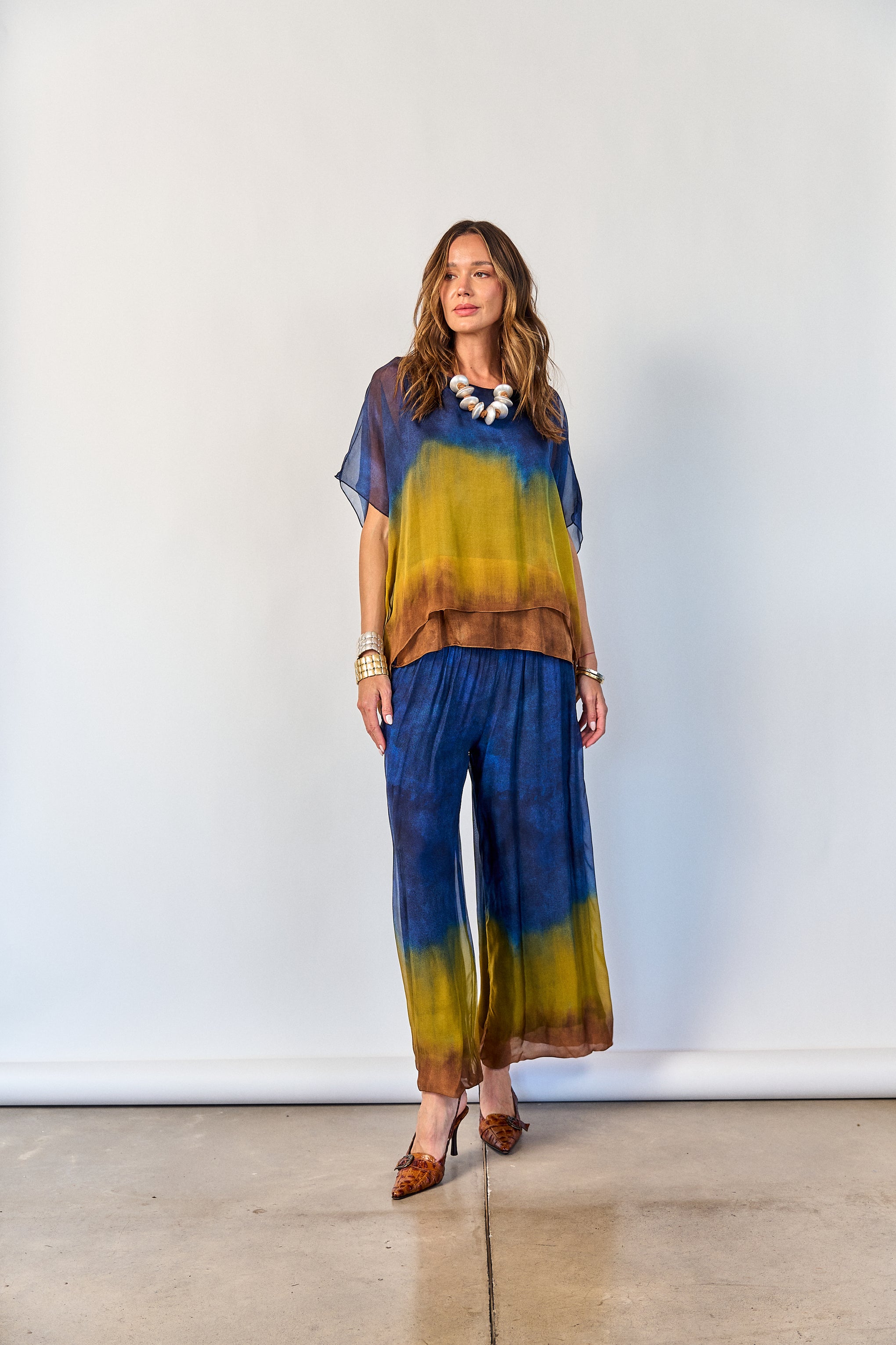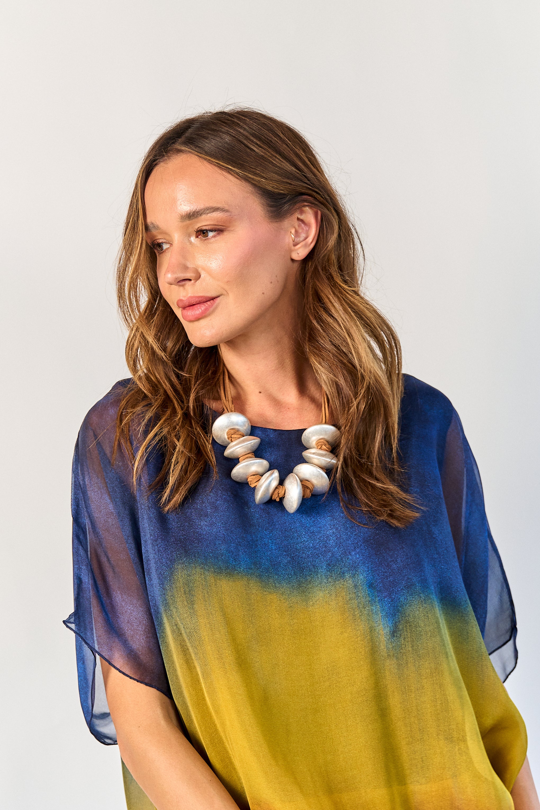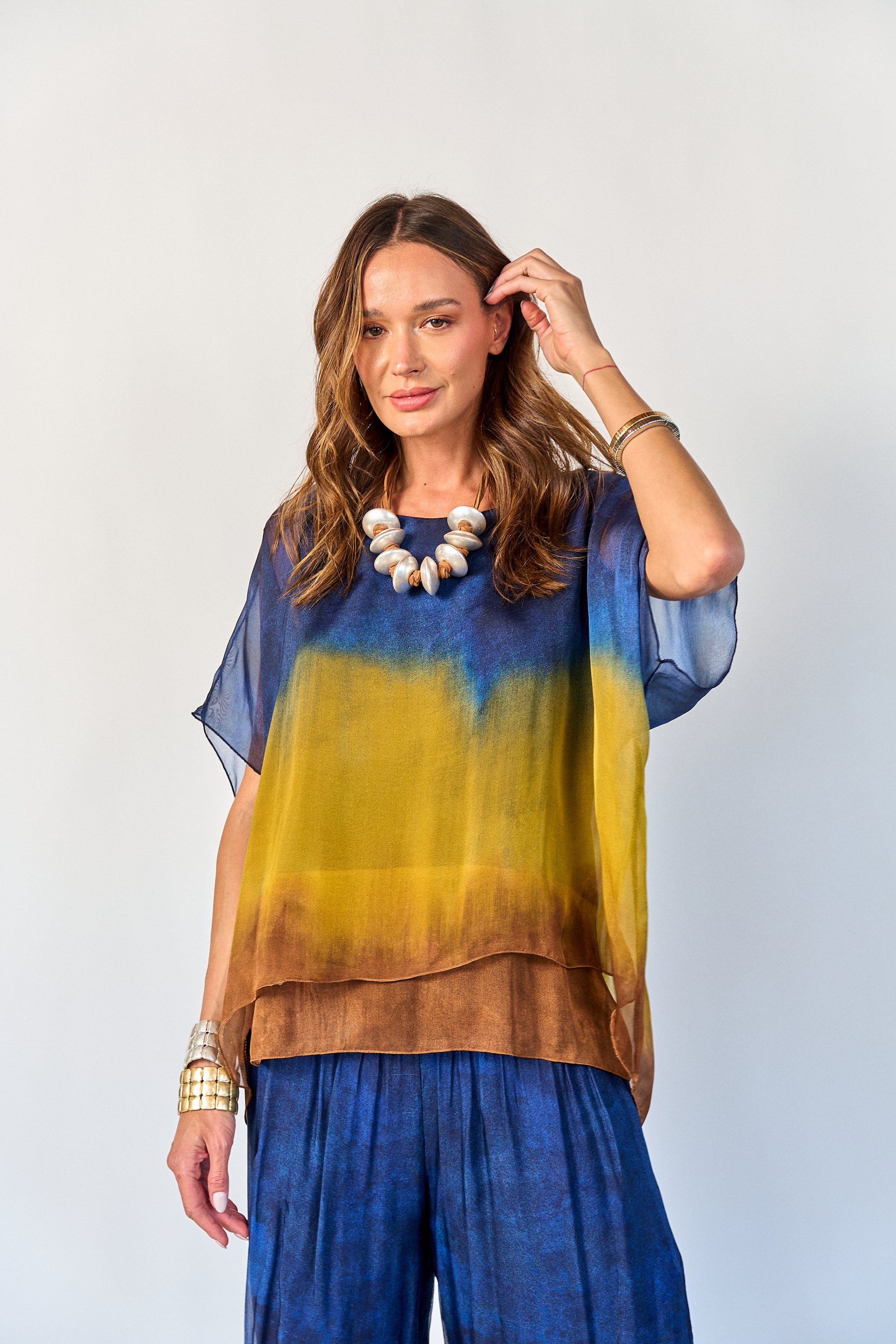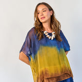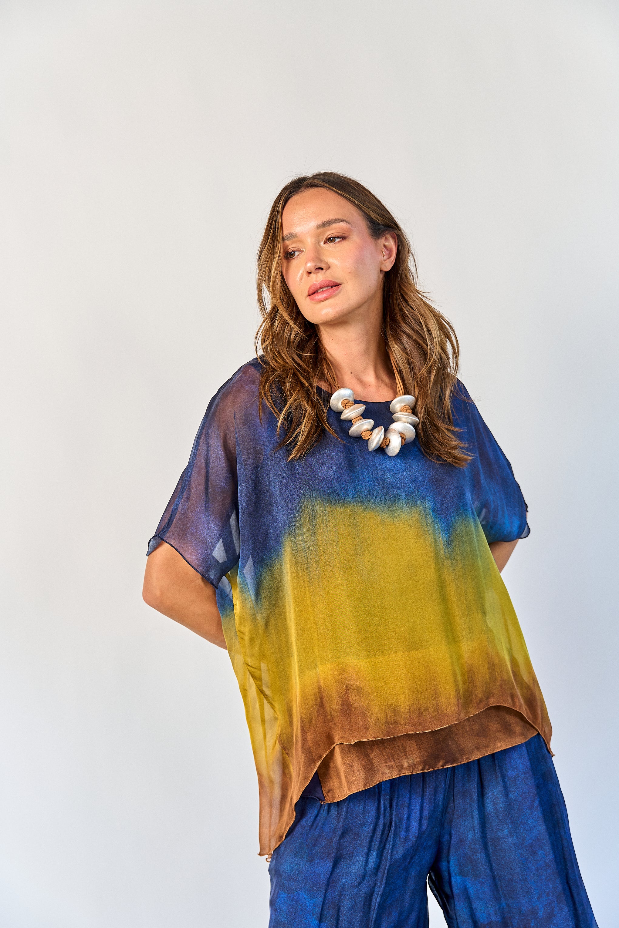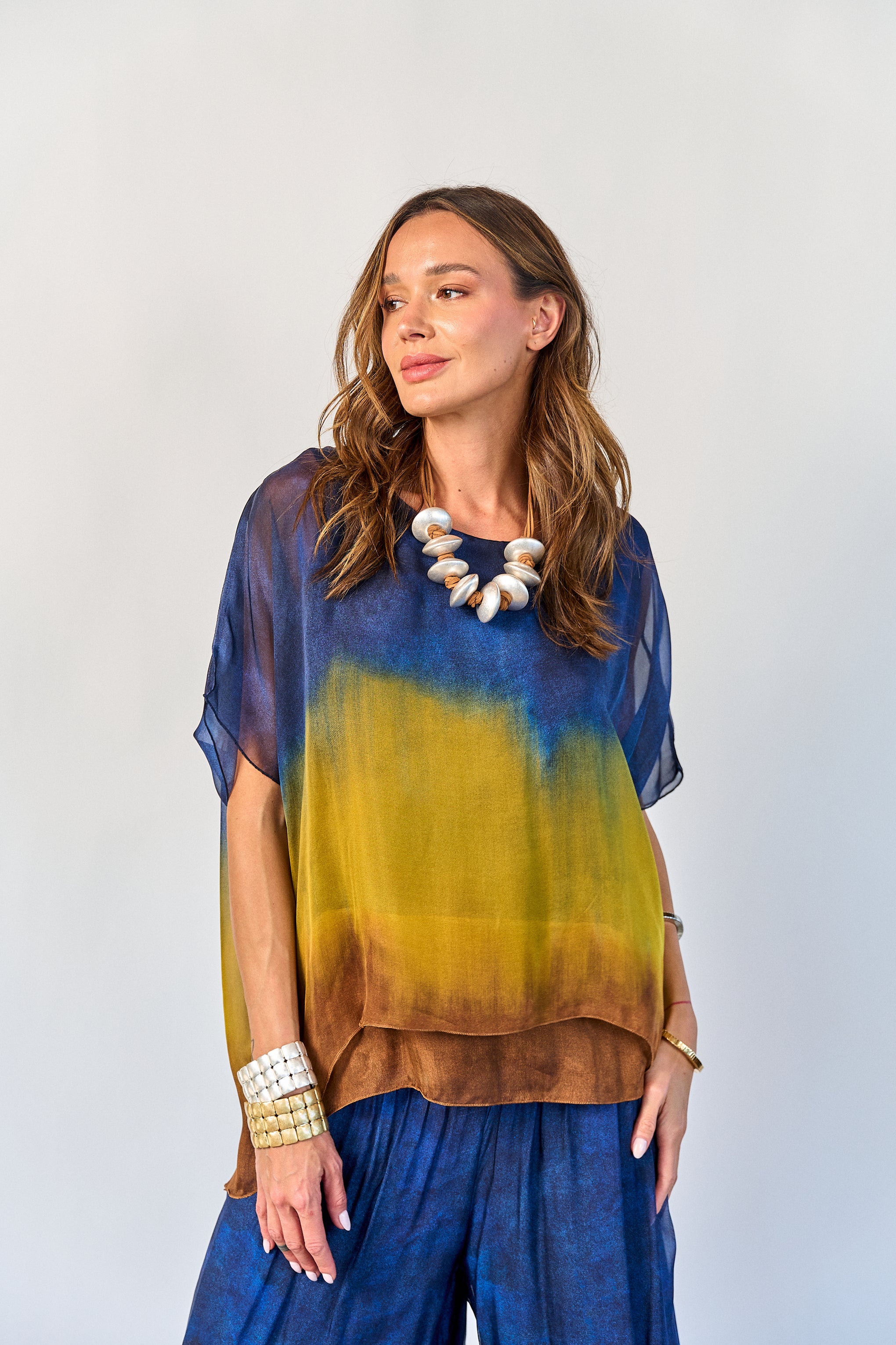 Blusa de seda efecto degradé en tonos azul, verde pistacho y café, corte recto estilo oversize, talla unica, peto de algodón con efecto doble en la parte de adelante, manga corta y un diseño ligero, es perfecta para los días cálidos o para combinar con prendas más formales. Ideal para crear looks frescos, femeninos y versátiles.