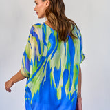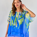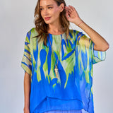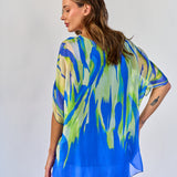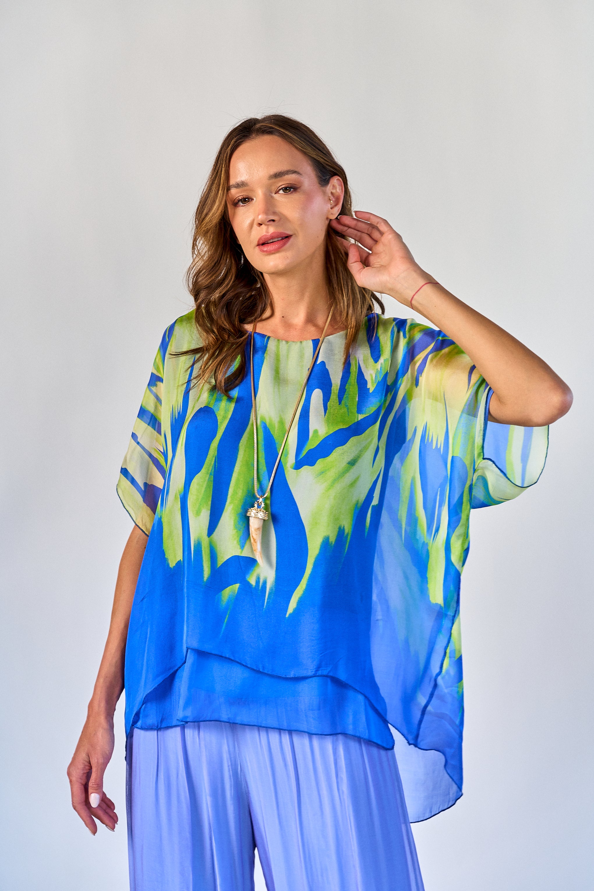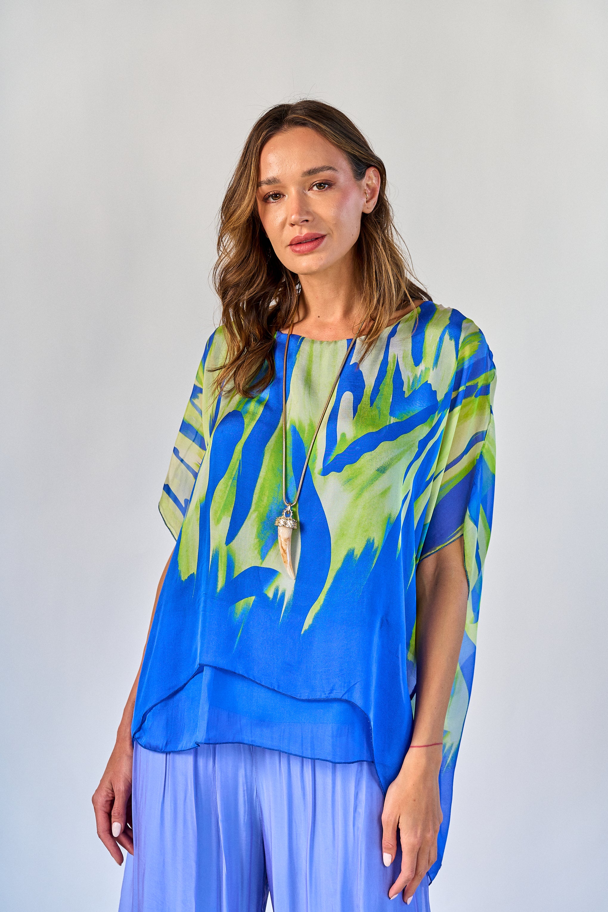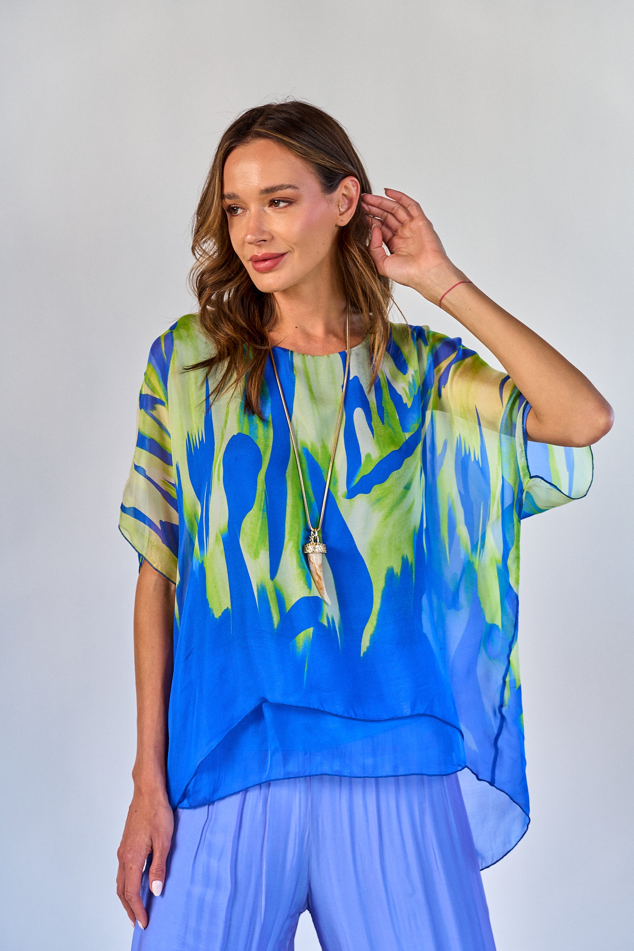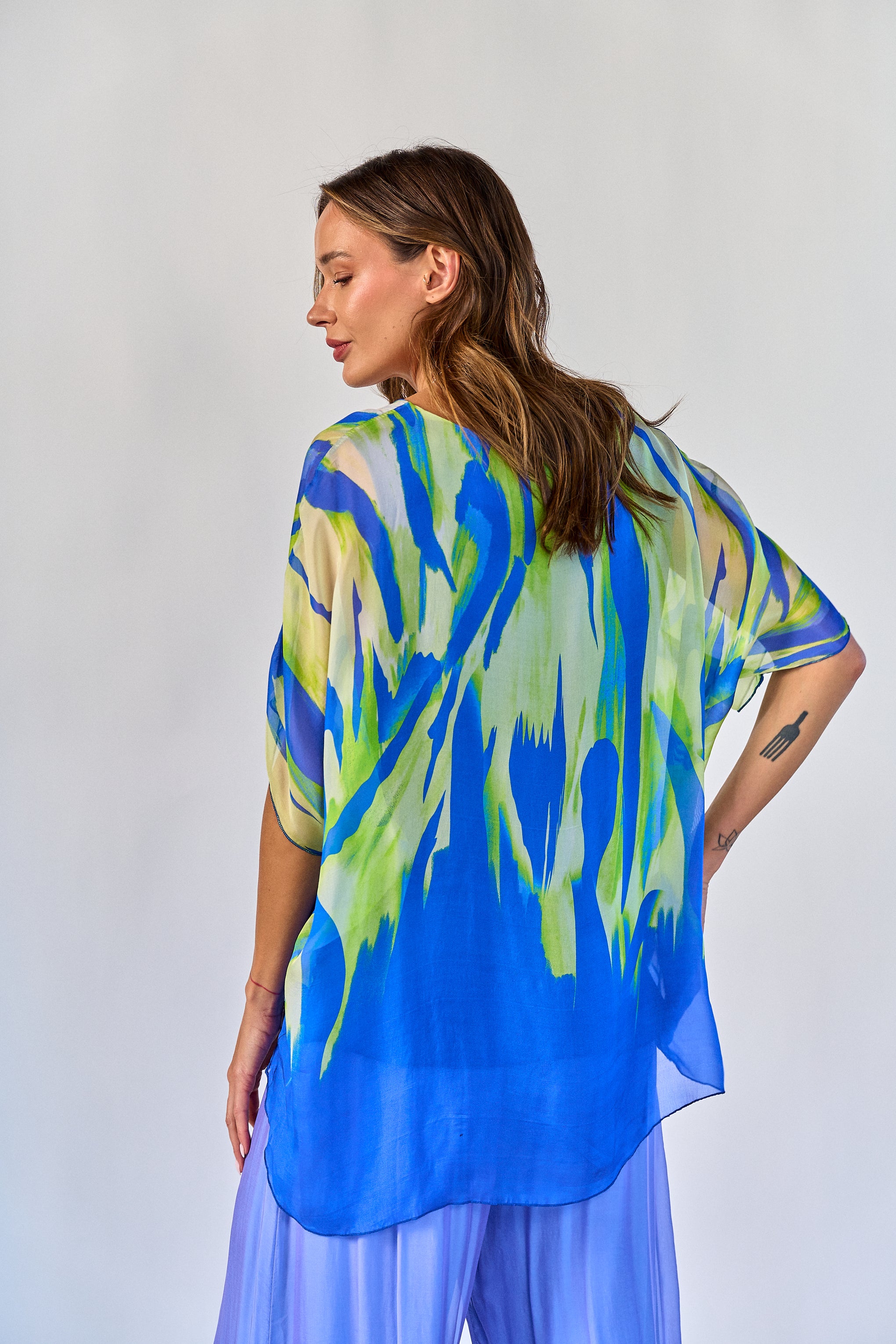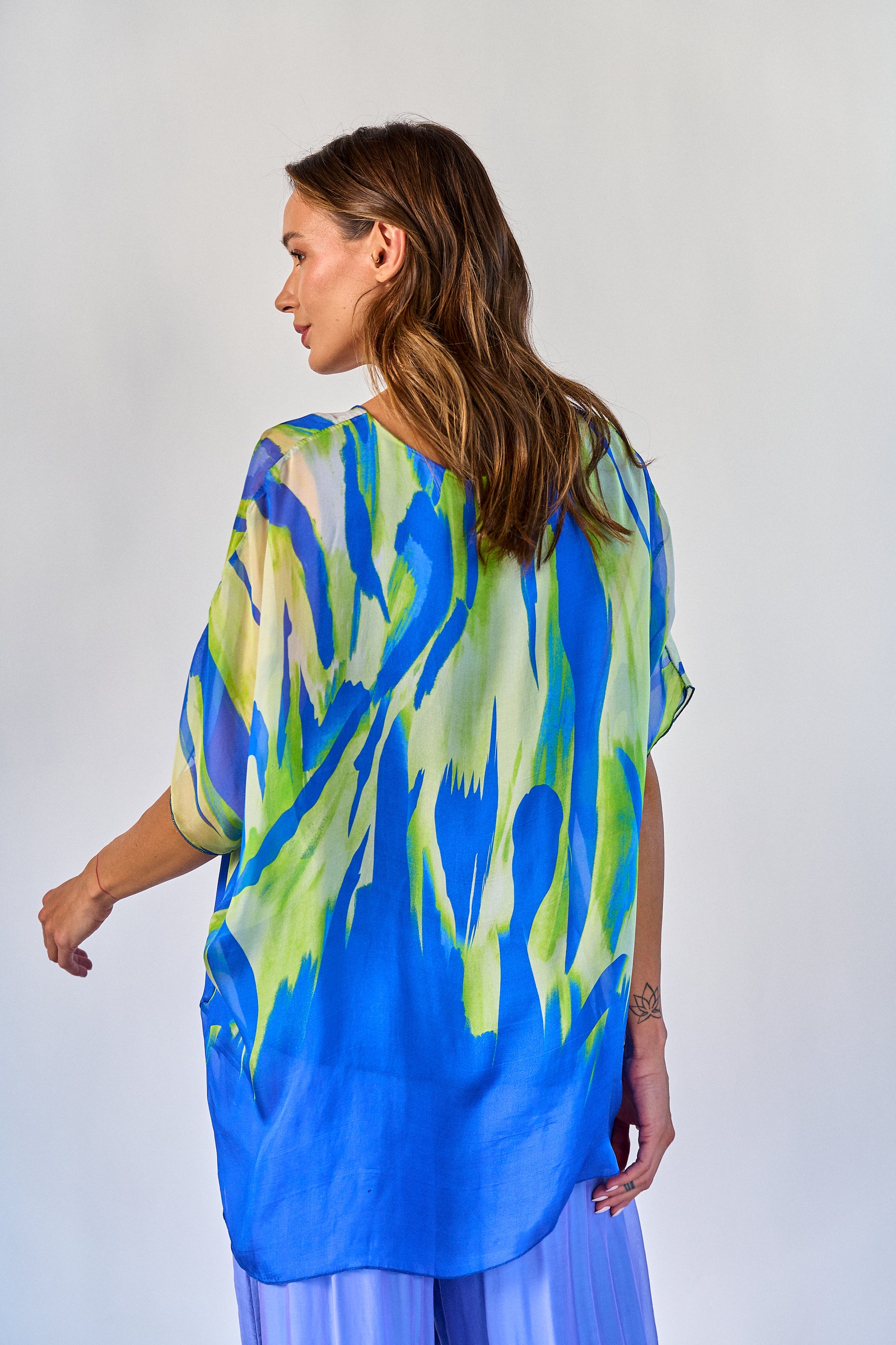 Blusa de seda estampada en tonos azul, verde y marfil, corte recto estilo oversize, talla unica, peto de algodón con efecto doble en la parte de adelante, manga corta y un diseño ligero, es perfecta para los días cálidos o para combinar con prendas más formales. Ideal para crear looks frescos, femeninos y versátiles.