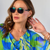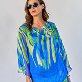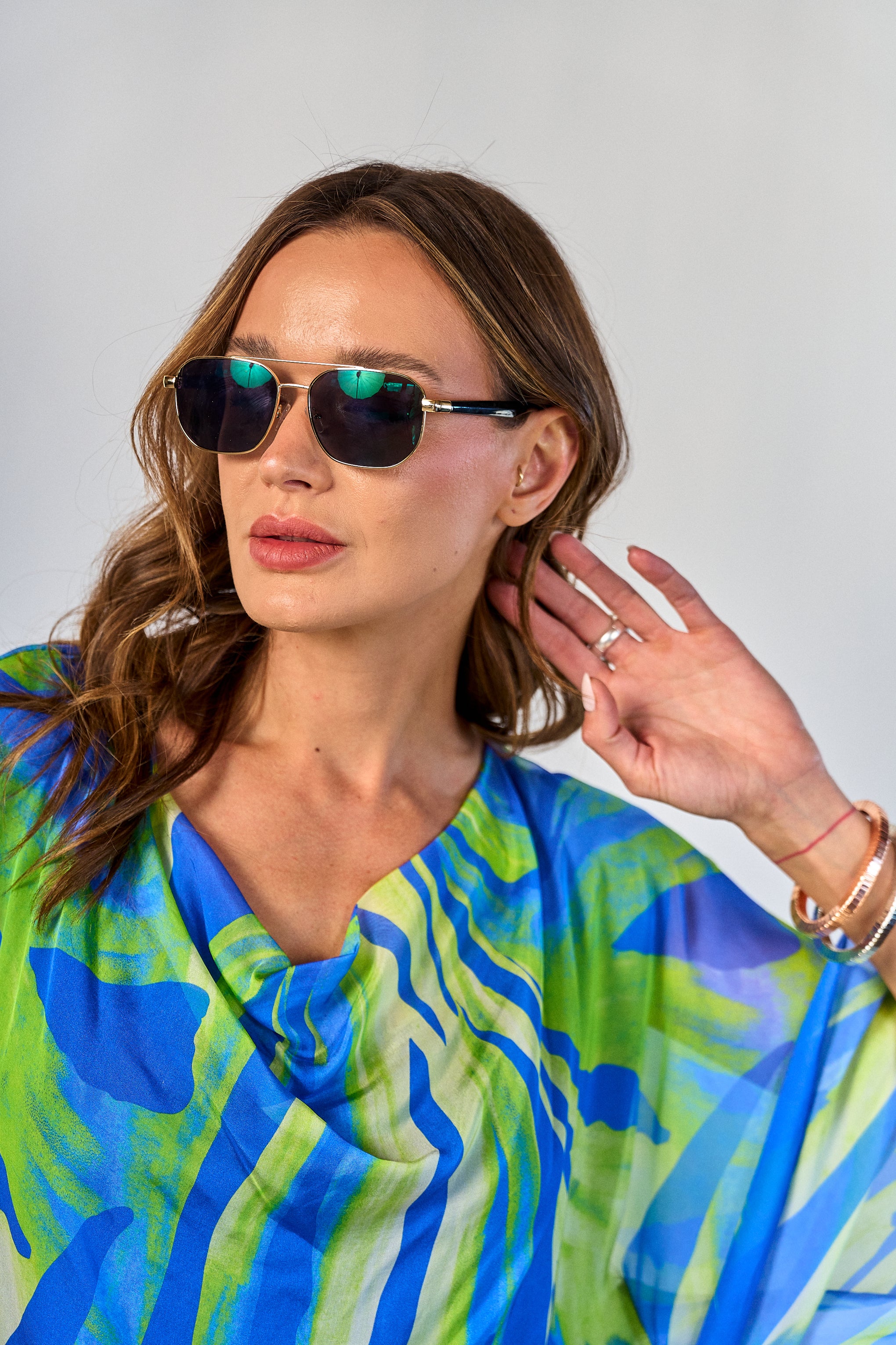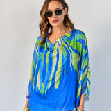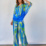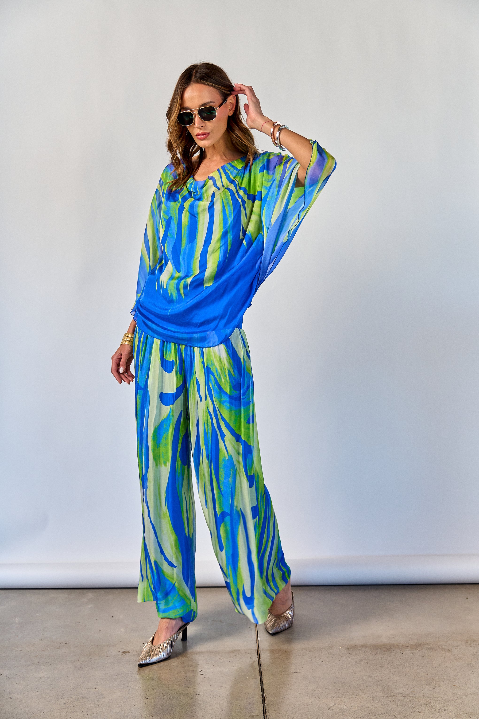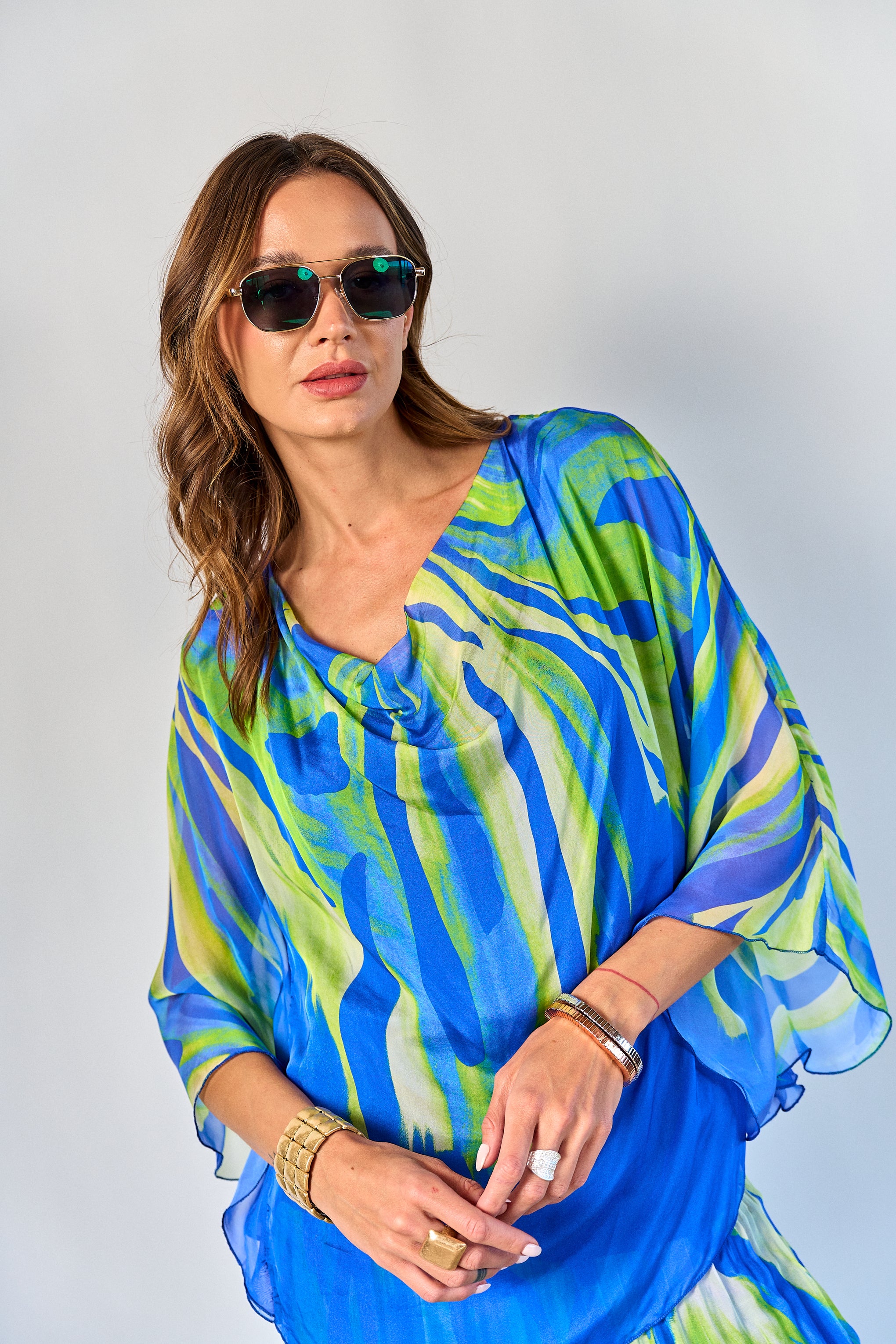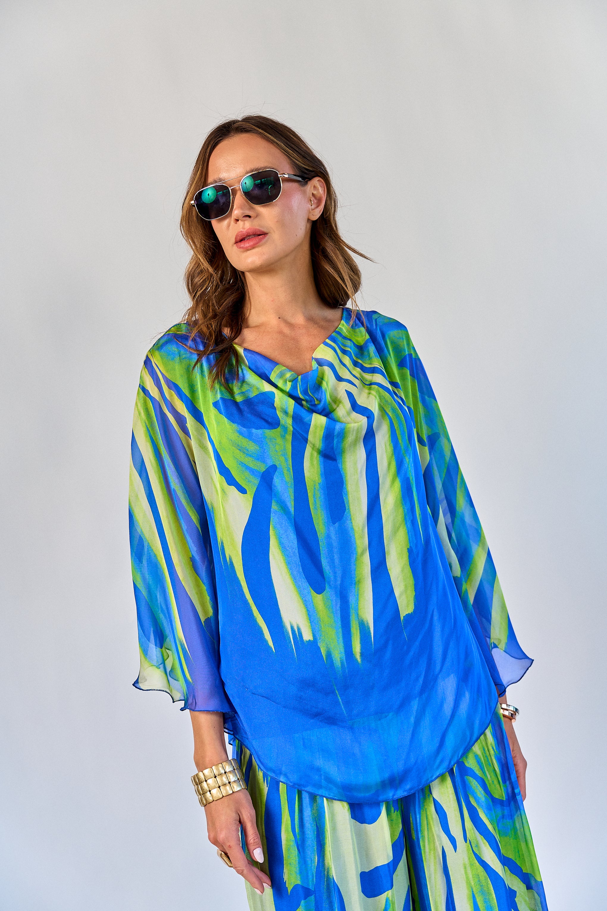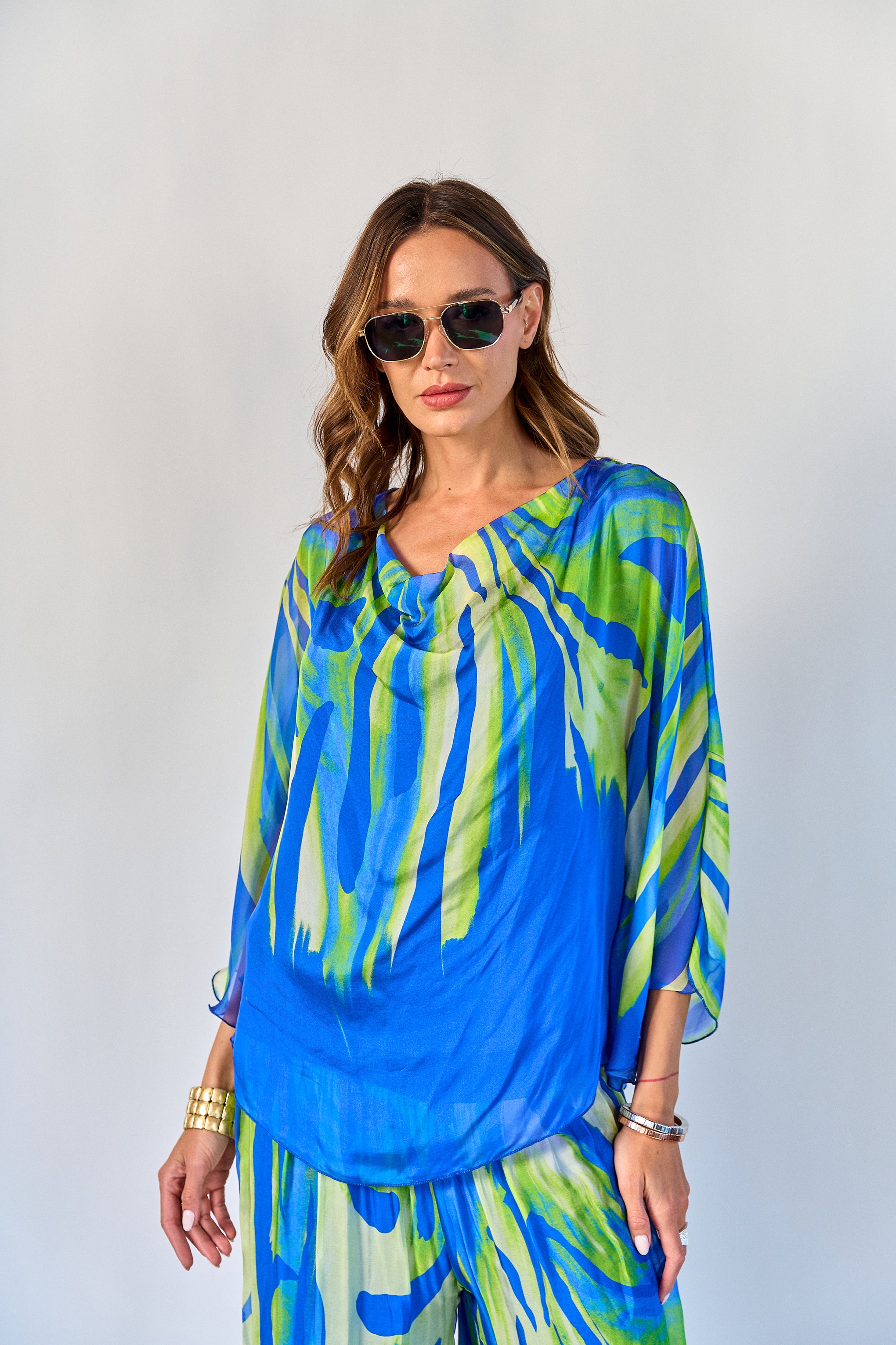 Destaca con esta elegante blusa de seda estampada, en tonos azul eléctrico, verde y marfil, diseñada con manga murciélago y cuello drapeado que aportan movimiento y sofisticación. Su peto interior de algodón brinda suavidad y comodidad, haciendo que sea ideal para usar durante todo el día.