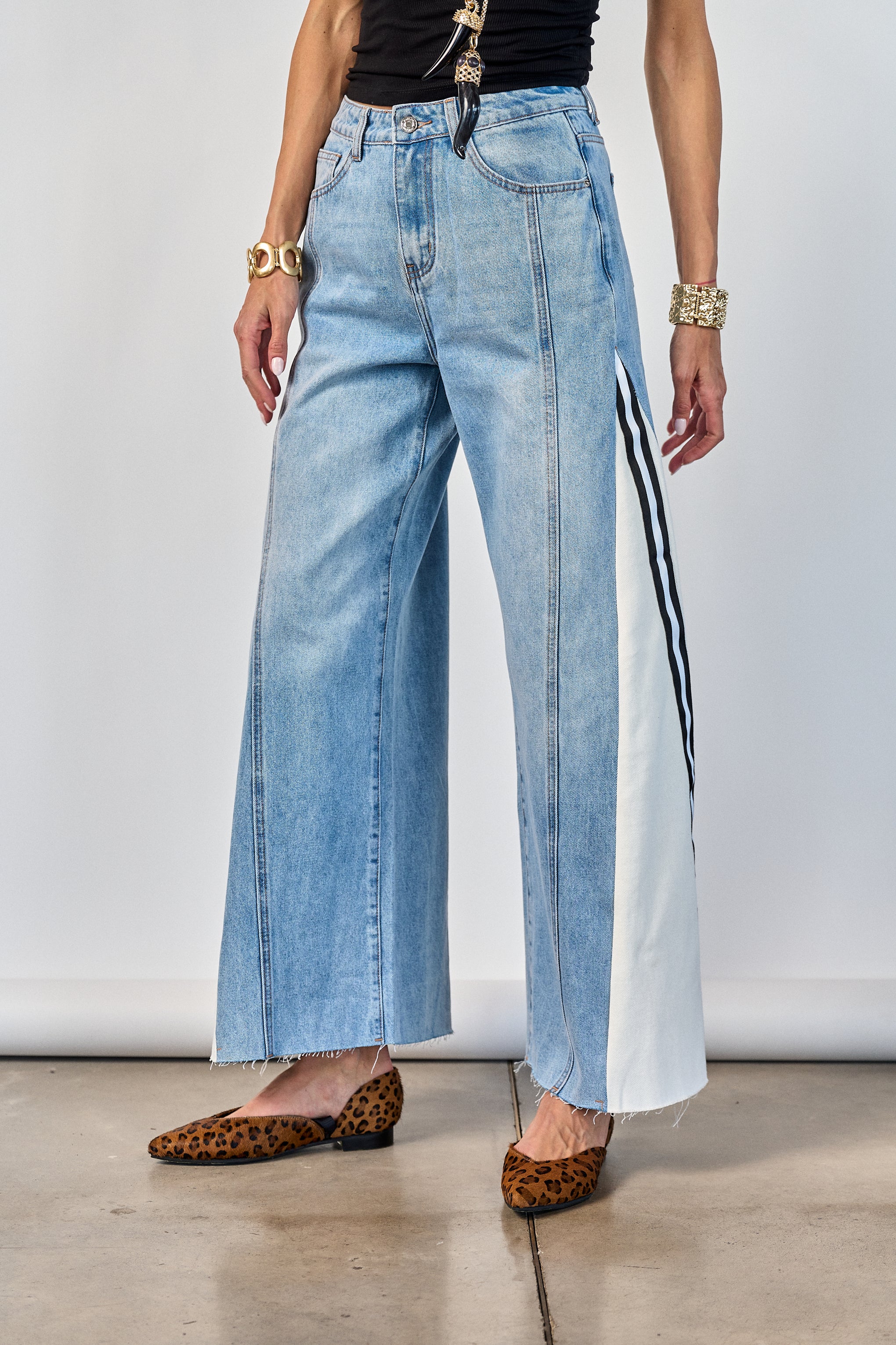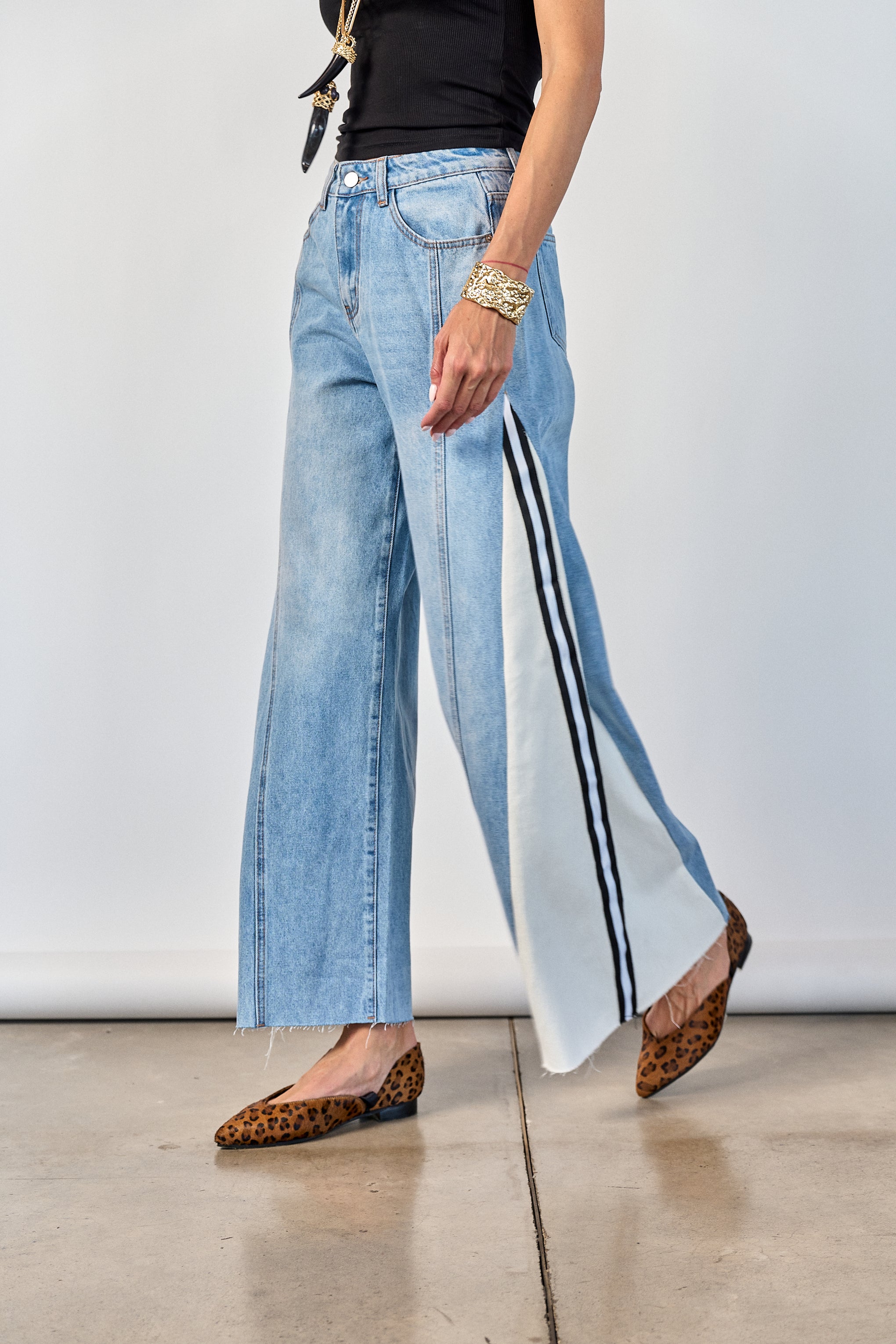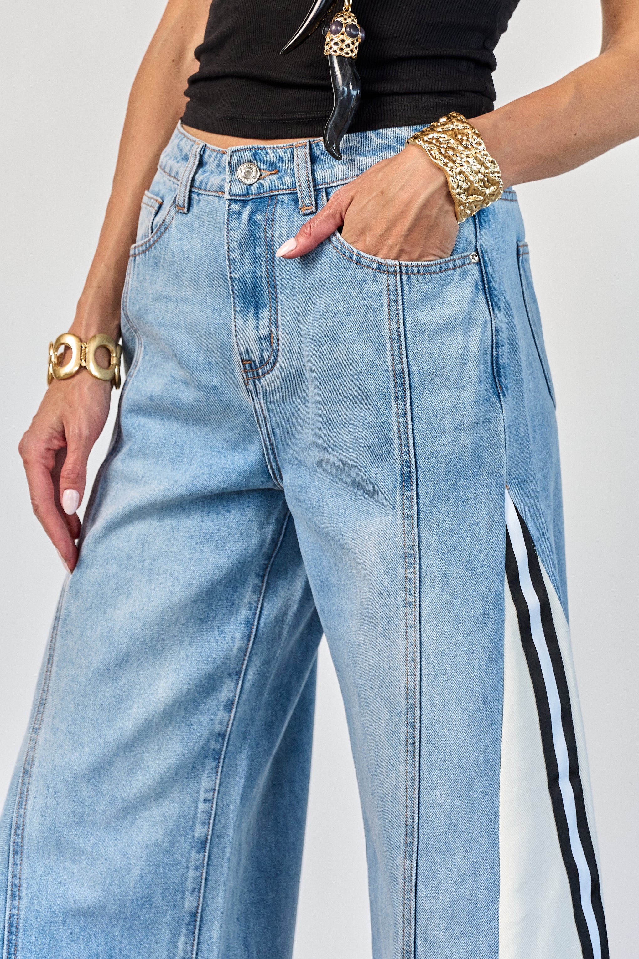 Jeans de corte bota campana, con detalle de líneas negras y blancas en la parte inferior que aportan un toque moderno y distintivo. Cuenta con bolsillos delanteros y traseros funcionales, confeccionado en denim de excelente calce y comodidad.