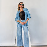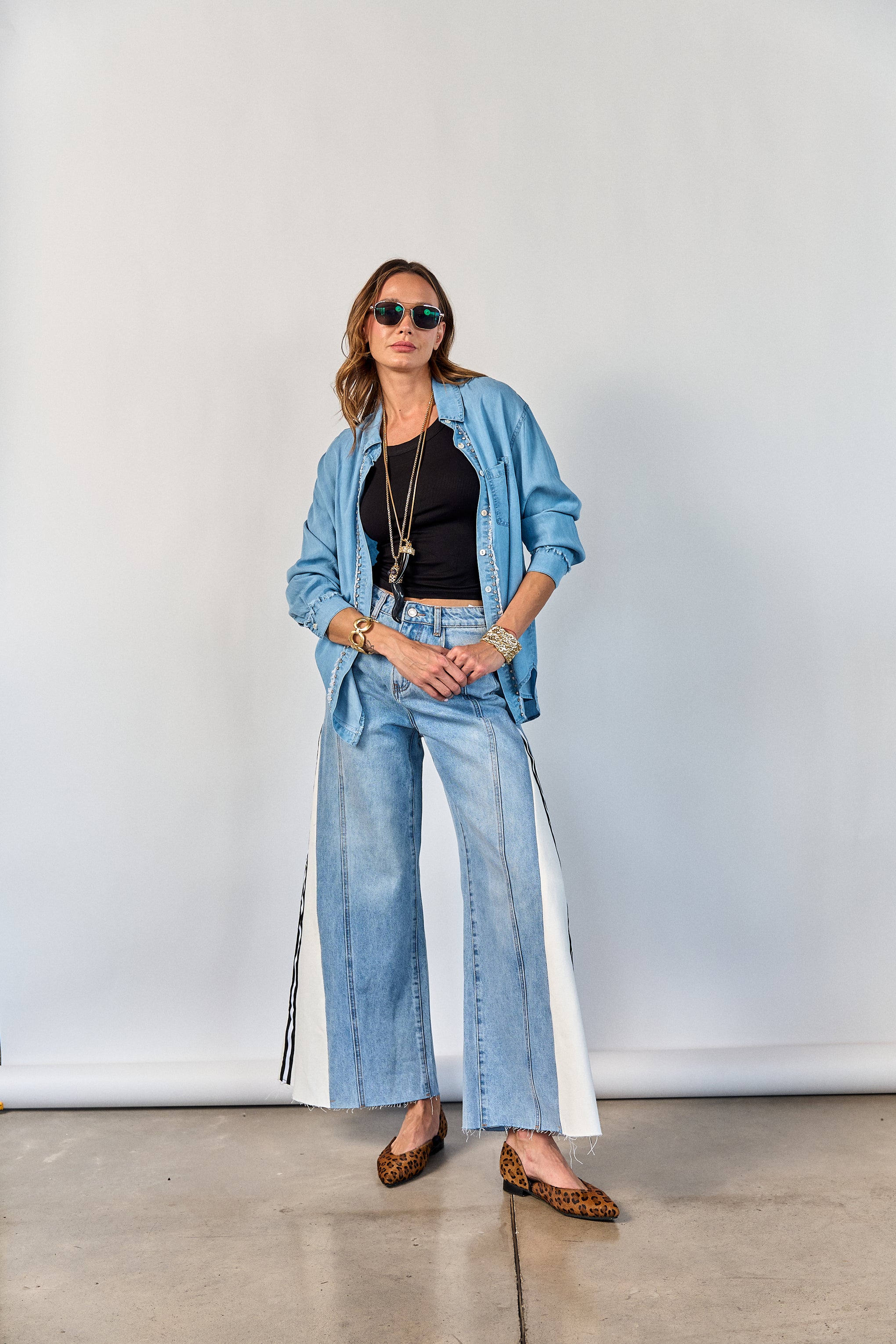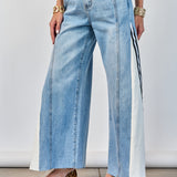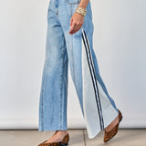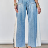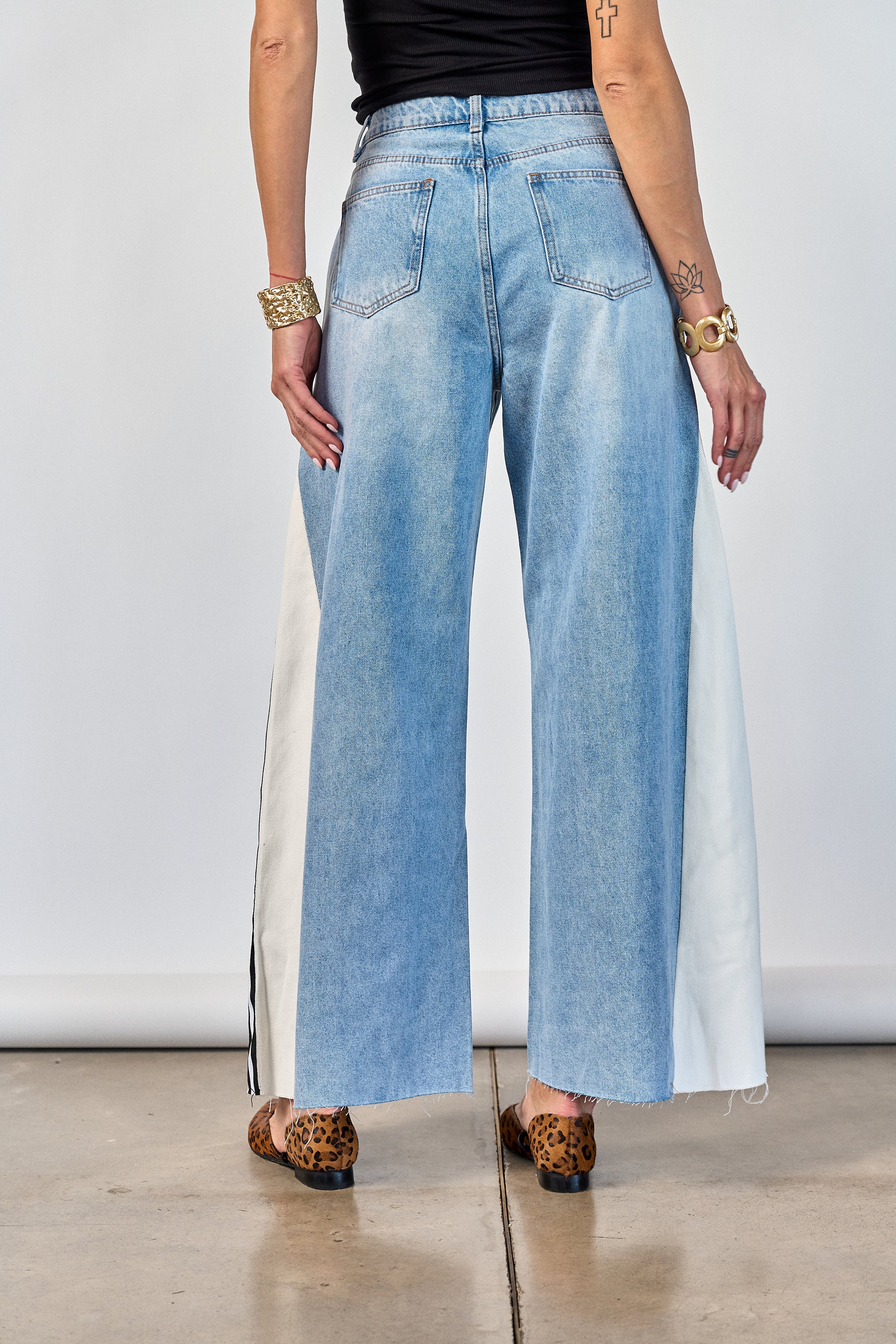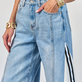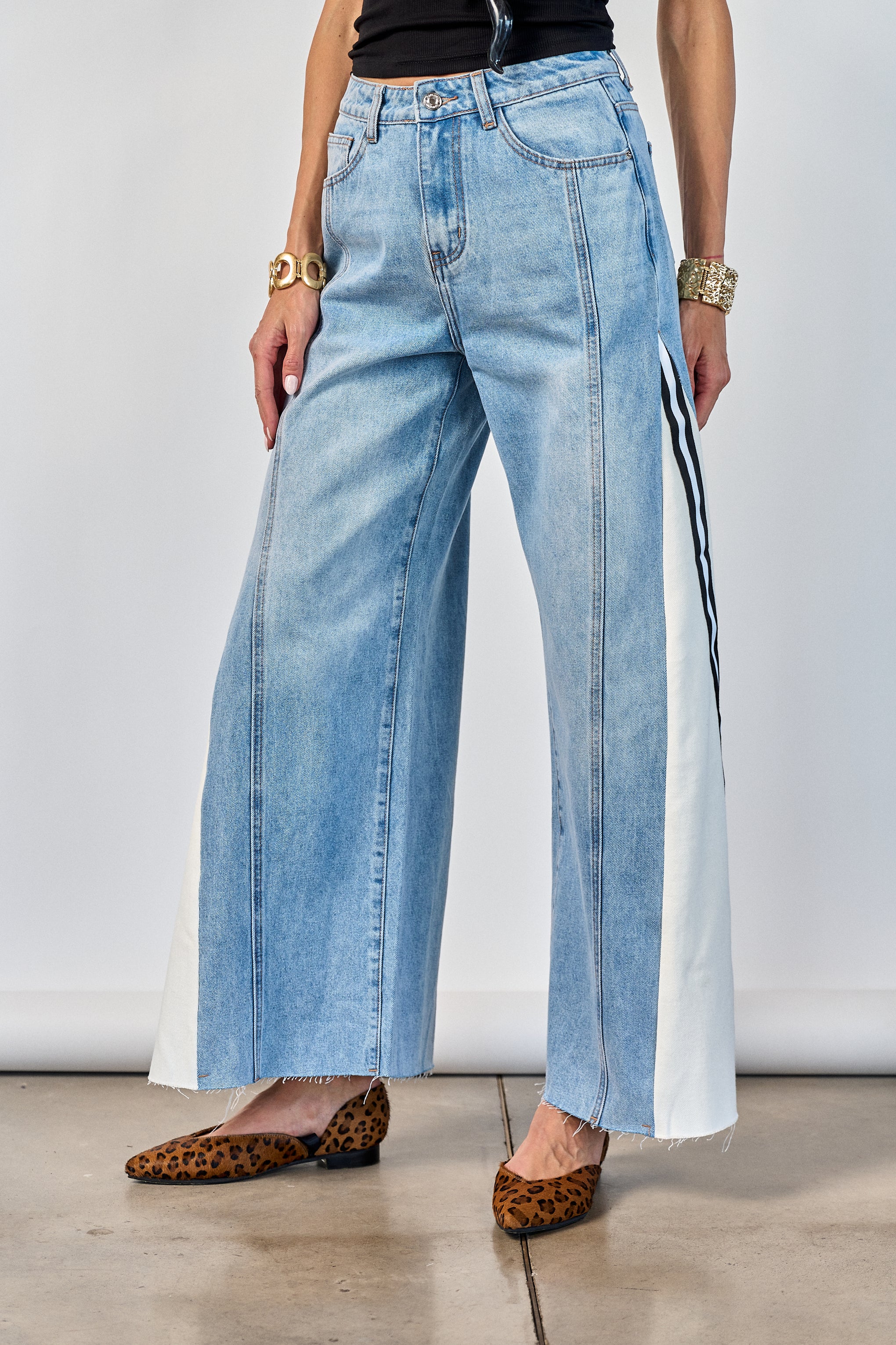 Jeans de corte bota campana, con detalle de líneas negras y blancas en la parte inferior que aportan un toque moderno y distintivo. Cuenta con bolsillos delanteros y traseros funcionales, confeccionado en denim de excelente calce y comodidad.