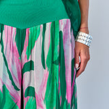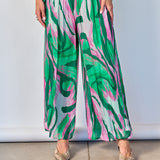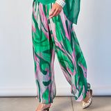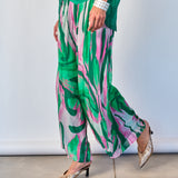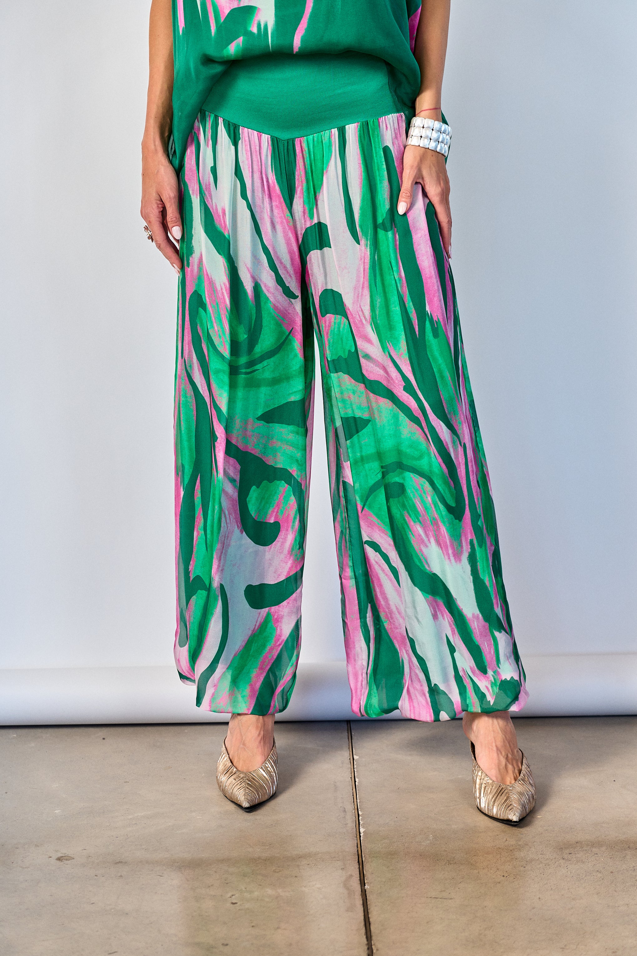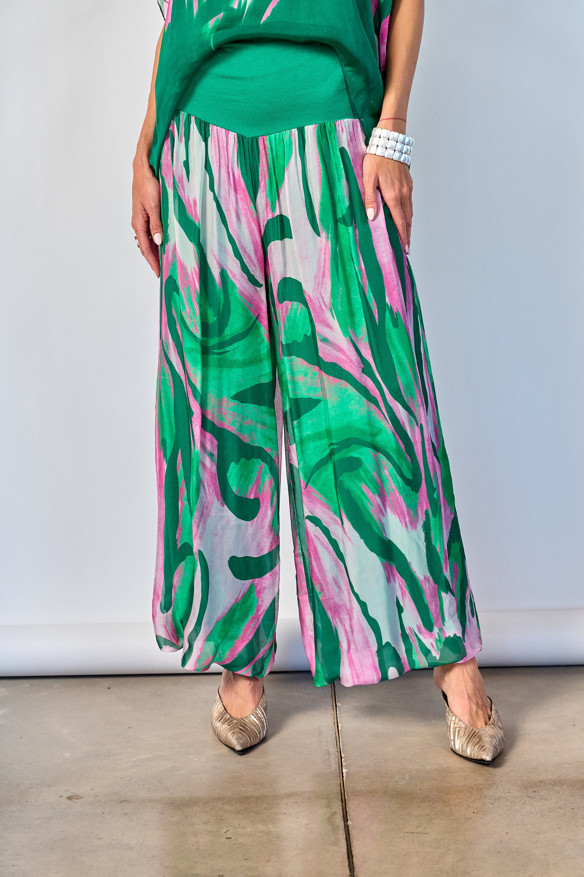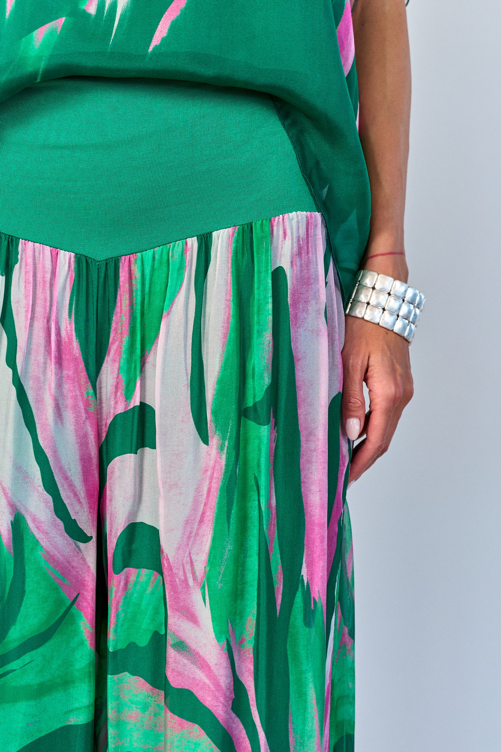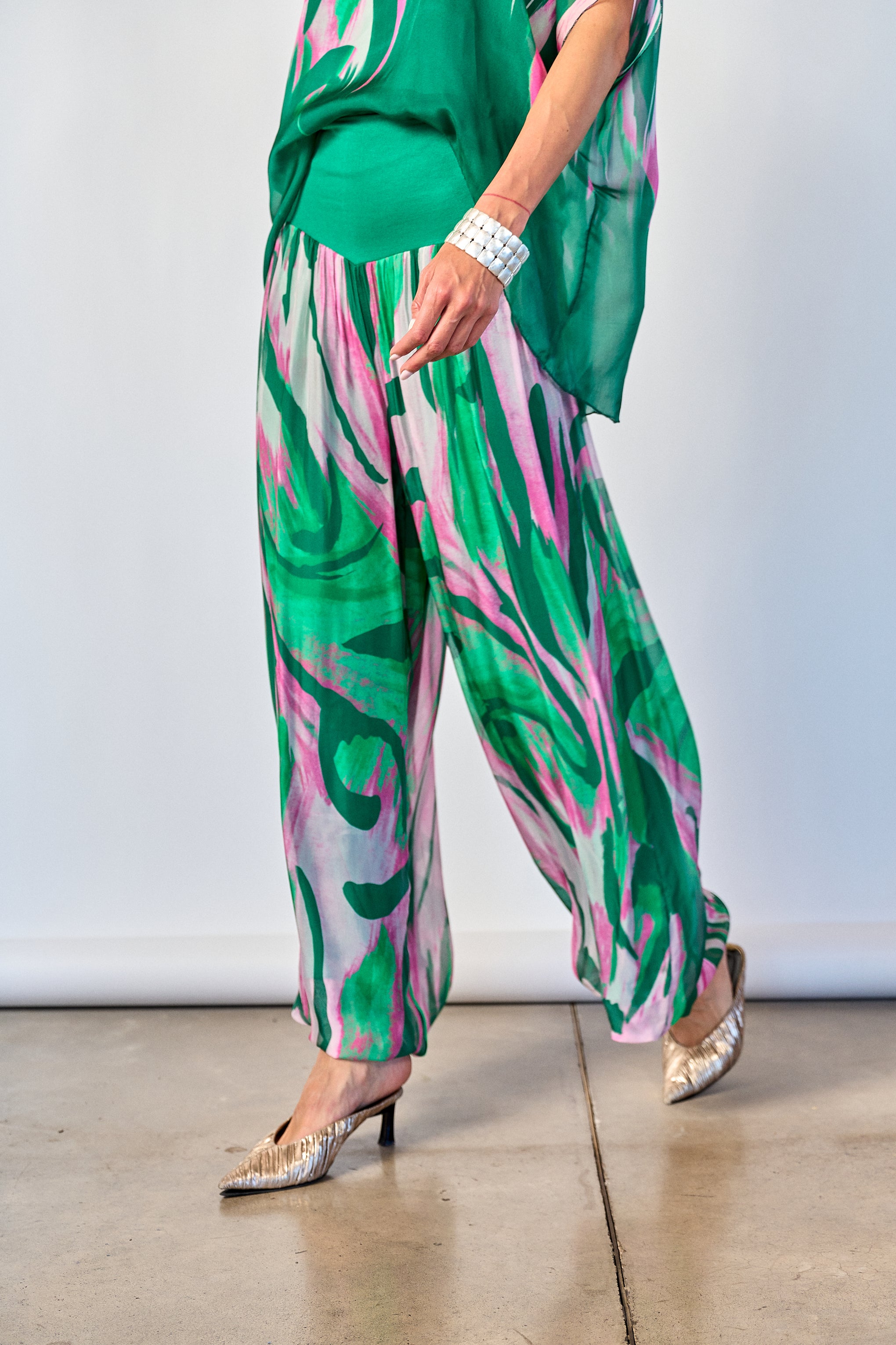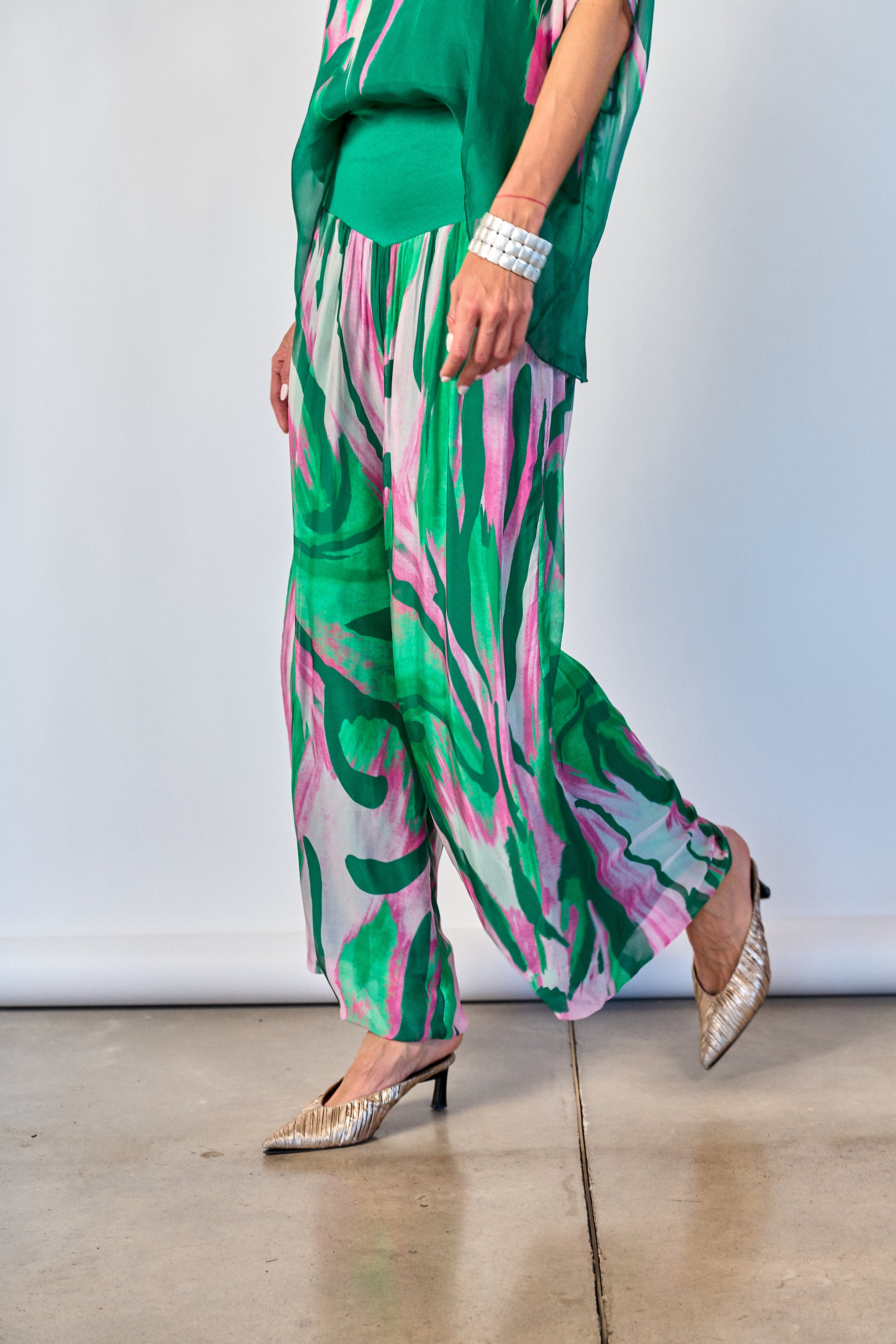 pantalón de seda estampado en tonos verdes, rosado y marfil, con pretina de algodón para un calce cómodo. Totalmente forrado, ofrece una caída fluida y elegante, ideal para un look sofisticado y confortable.