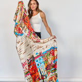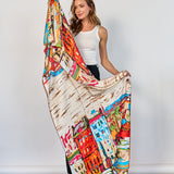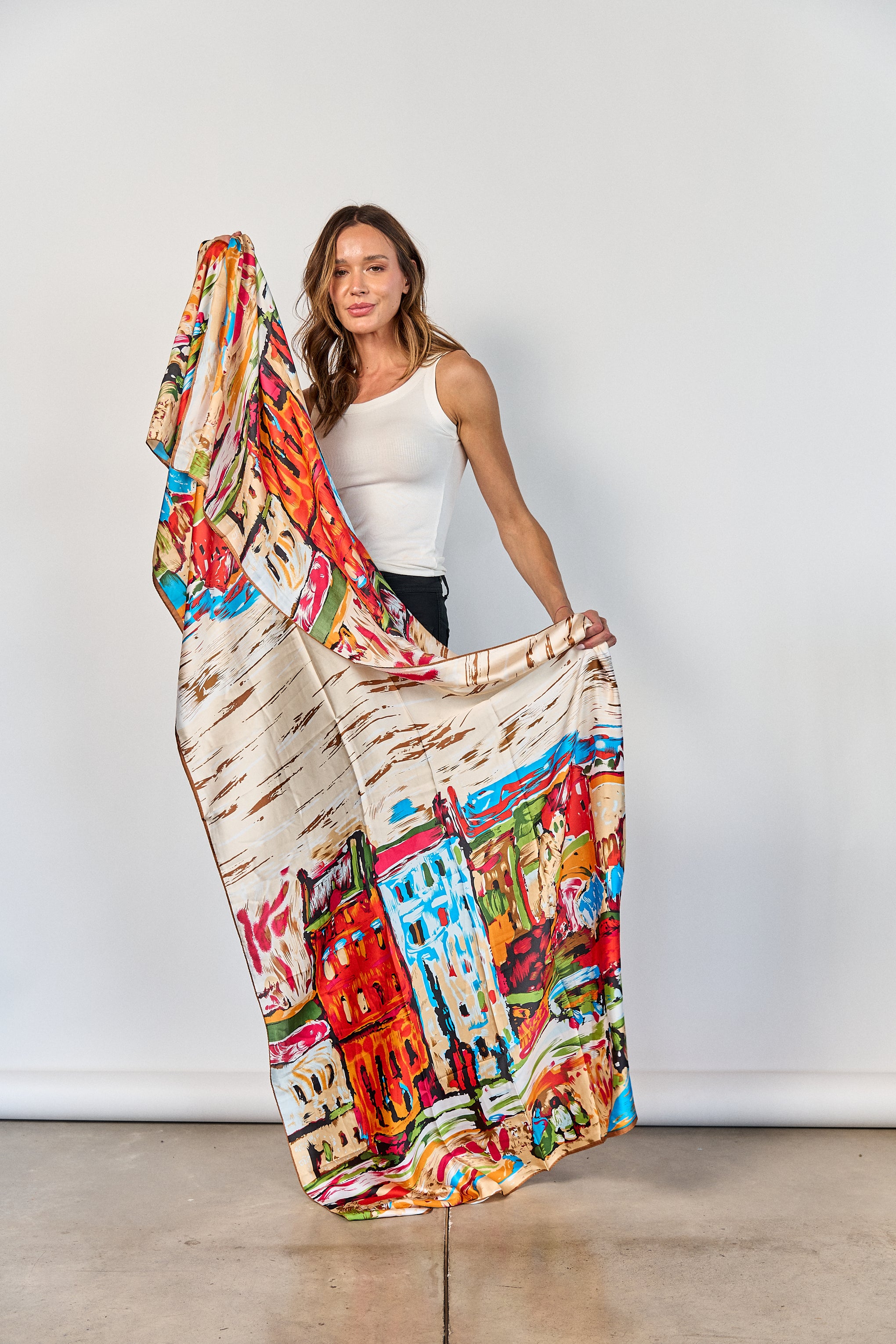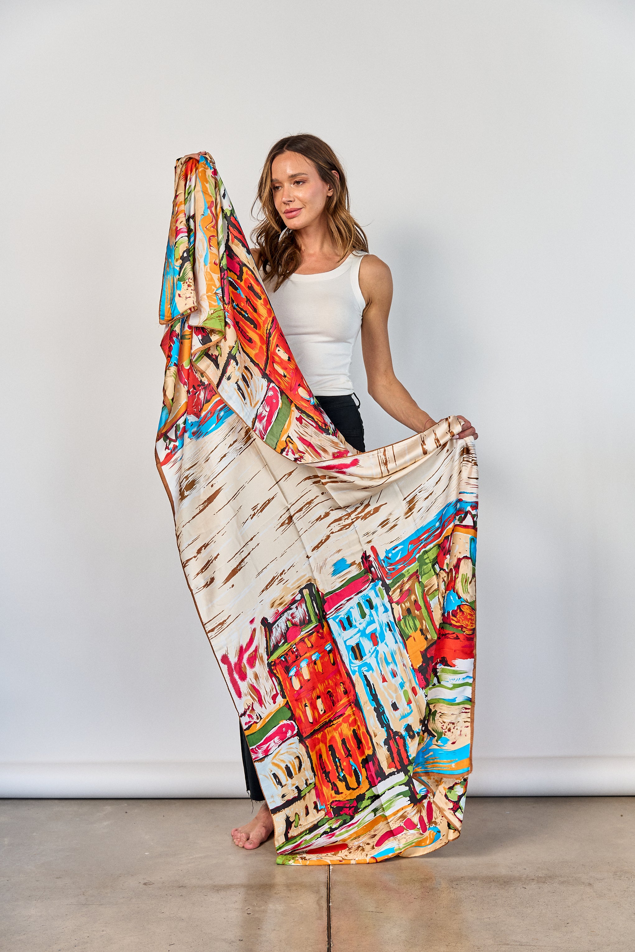 Pañuelo largo de seda natural, en tonos blanco, negro y grises con formato rectangular de 2 mts por 80 cm. Presenta un delicado estampado inspirado en paisajes de Venecia, que aporta un toque sofisticado y versátil. Ideal para complementar distintos estilos y lucirlo de múltiples formas. Procedencia italiana.