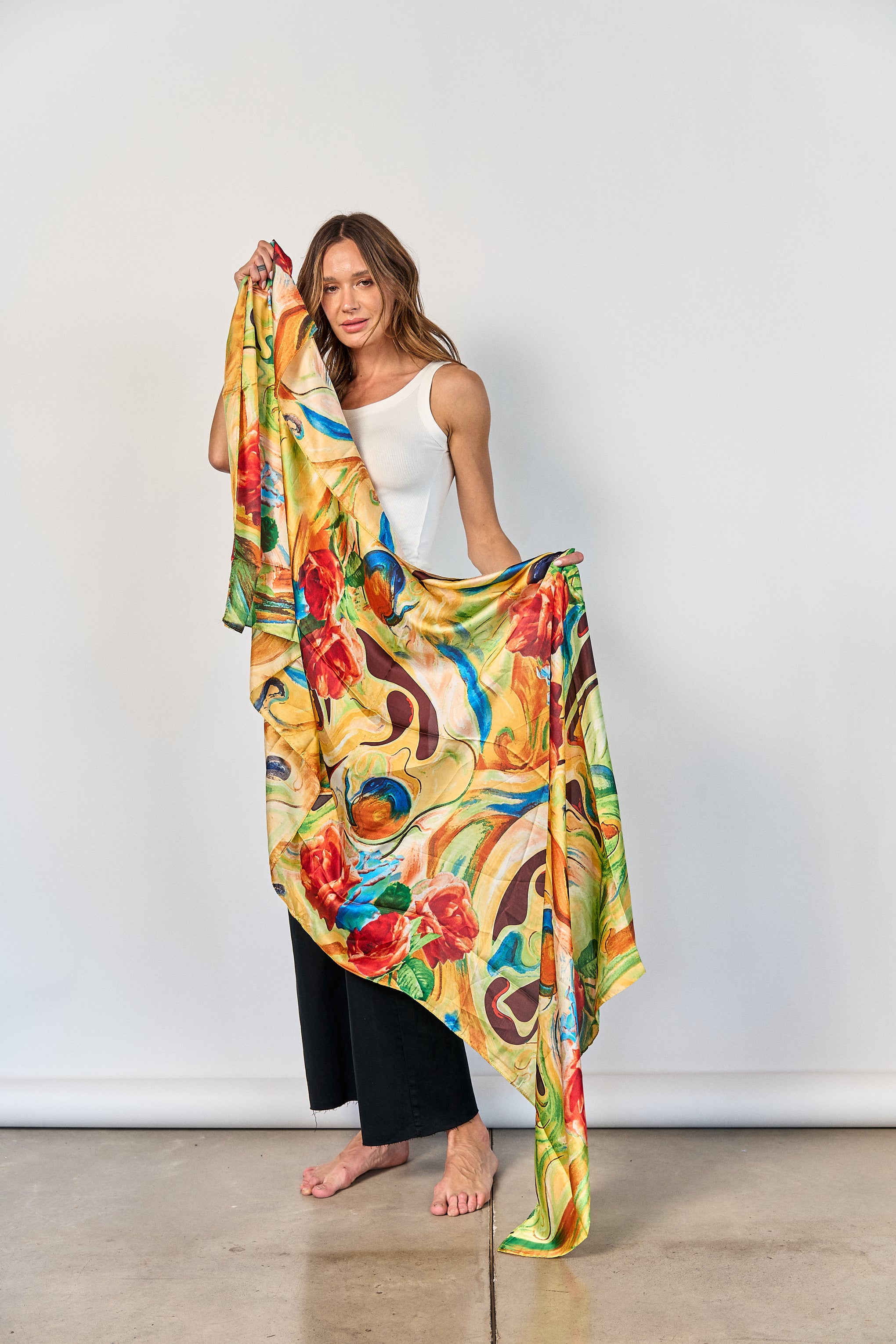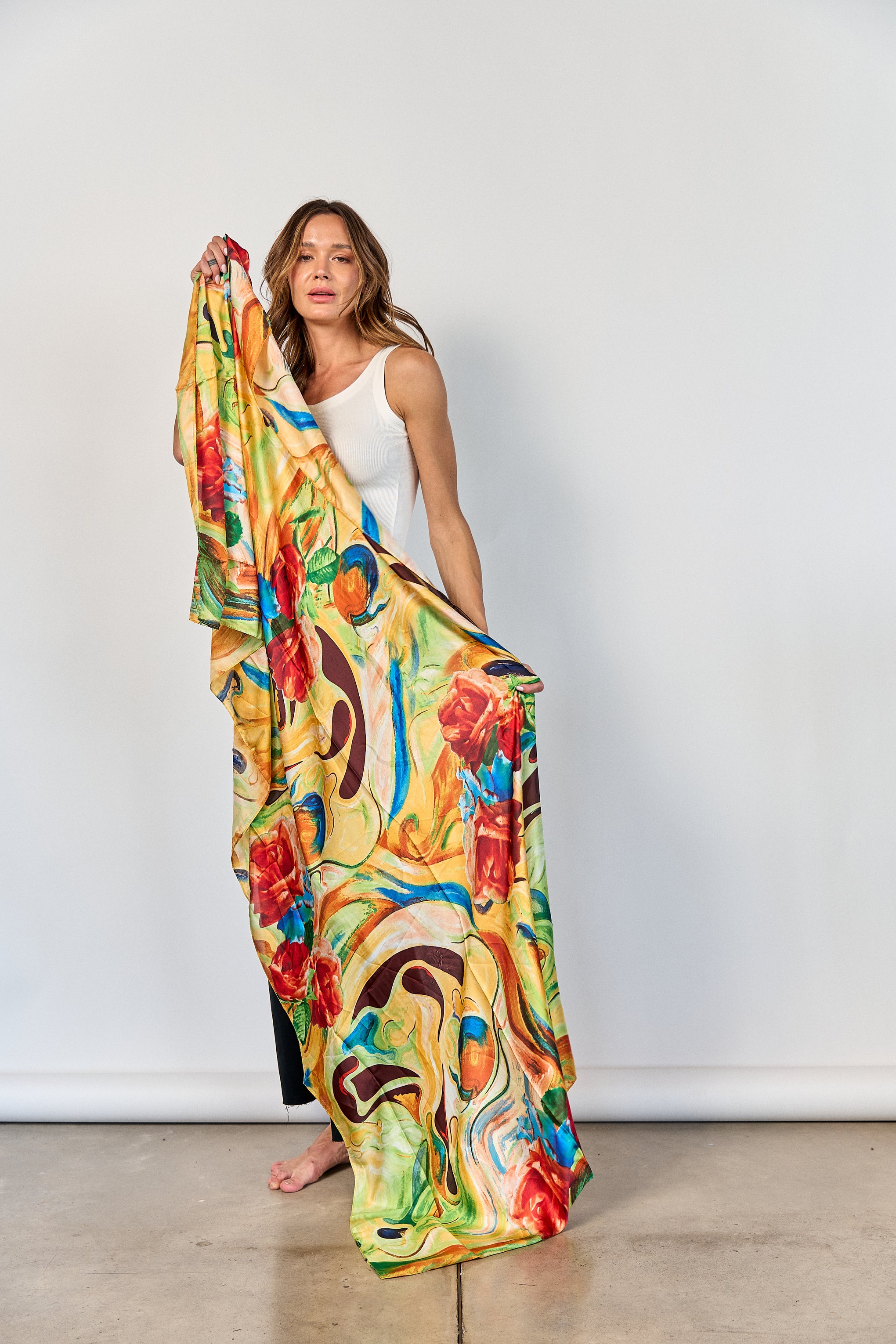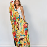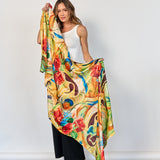 Pañuelo largo de seda natural, en tonos amarillo, verde, naranjo y amarillo con formato rectangular de 2 mts. por 80 cm. Su delicado estampado aporta un toque sofisticado y versátil, ideal para complementar distintos estilos y lucirlo de múltiples formas